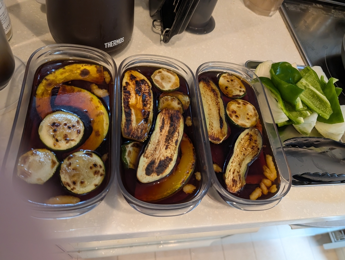 焦げ目がつくように適当に炒めた野菜を、これまた適当に麺つゆ・酢・チューブ生姜・水で作った漬け液に投入して冷蔵庫保存。